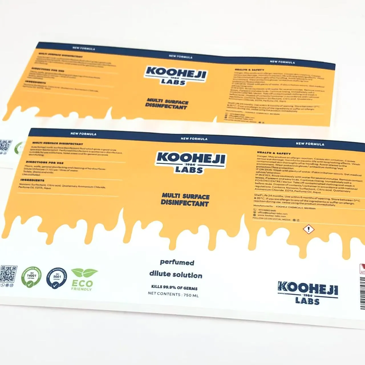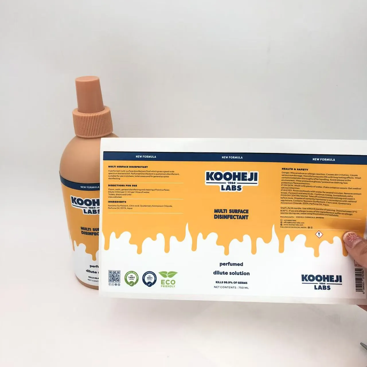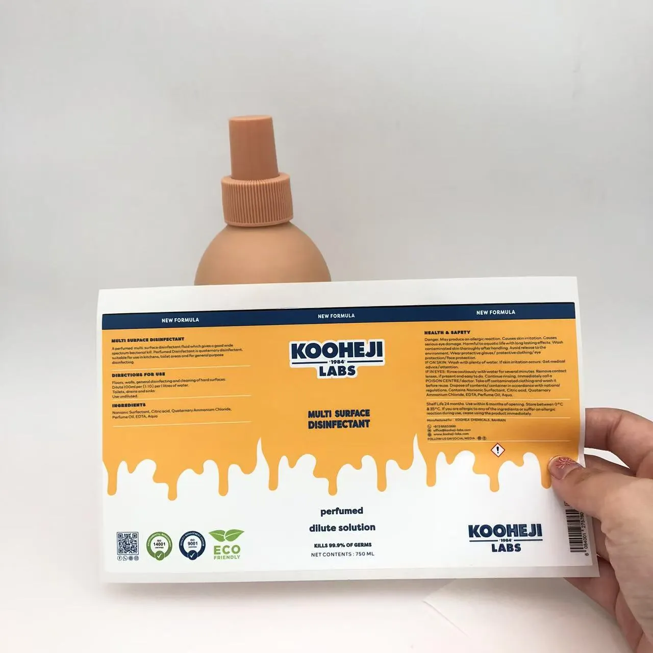 JOJO Packглибоко займається персоналізацією етикеток упаковки дезінфікуючих пляшок, ми знайомі з вимогами до матеріалів і стандартами безпеки дезінфікуючих засобів у медичних, побутових, комерційних і промислових сферах, гарантуючи, що індивідуальні етикетки повністю адаптуються до жорстких умов використання.