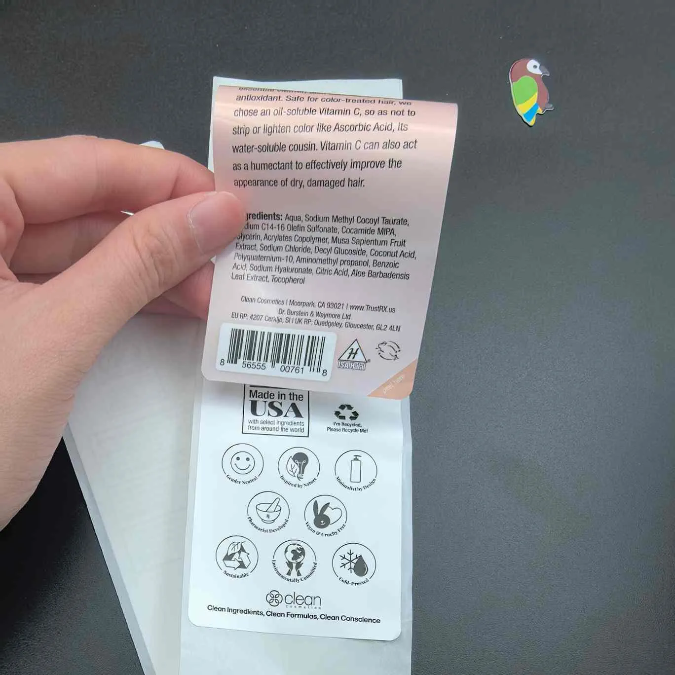 A: Це етикетка з 2+ шарами для косметики. Очистіть зовнішній шар, щоб побачити додаткову інформацію на внутрішньому шарі, не збільшуючи розмір етикетки.