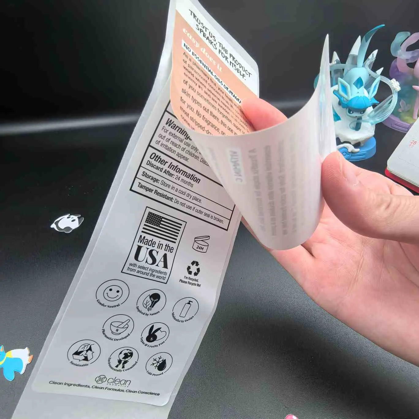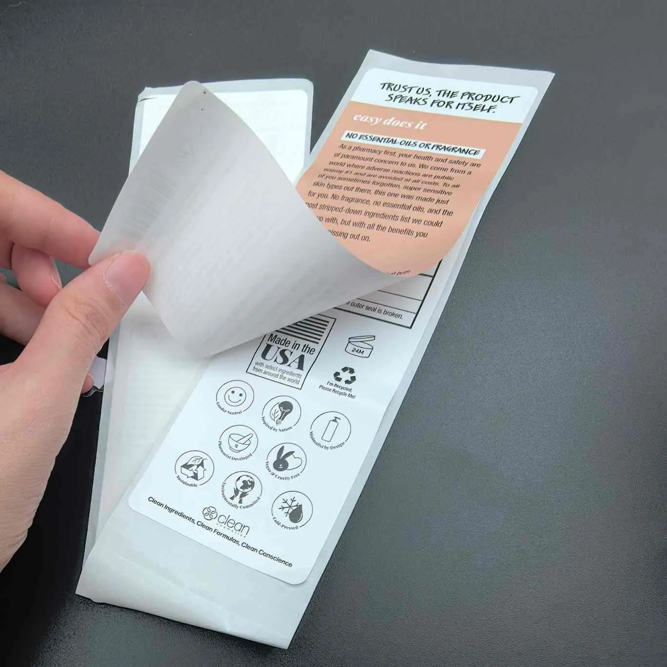 Очистіть і прочитайте етикетки:Найпростіший тип, його також називають багатошаровим для косметичних етикеток. Верхній шар легко відклеїти, а внутрішній шар містить розширену інформацію. Його часто використовують для масок для обличчя, сироваток та інших продуктів у невеликій упаковці.