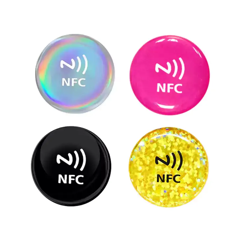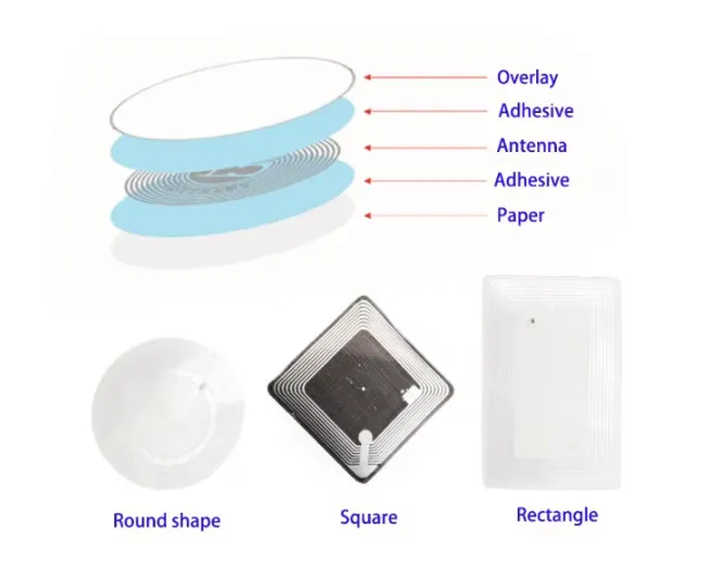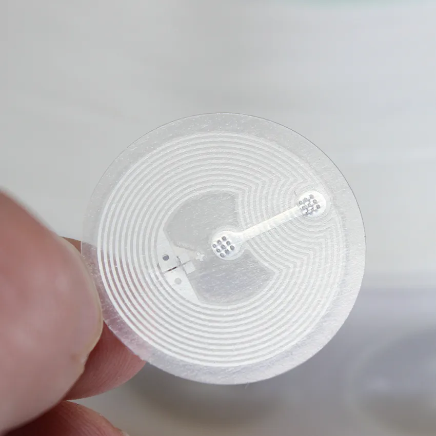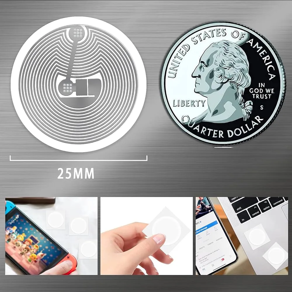 Розмір і форма: наклейки NFC невеликі. Вони часто круглі і розміром з монету. Одна сторона має клей, тому ви можете легко приклеїти їх на такі речі, як плакати, браслети або візитні картки.
