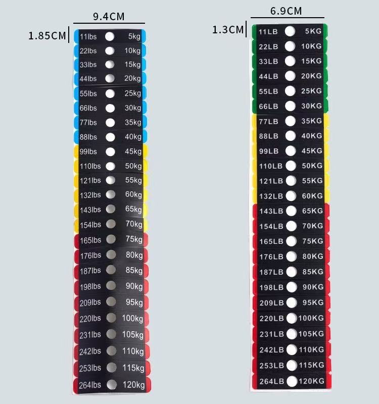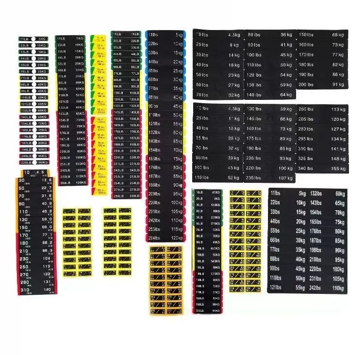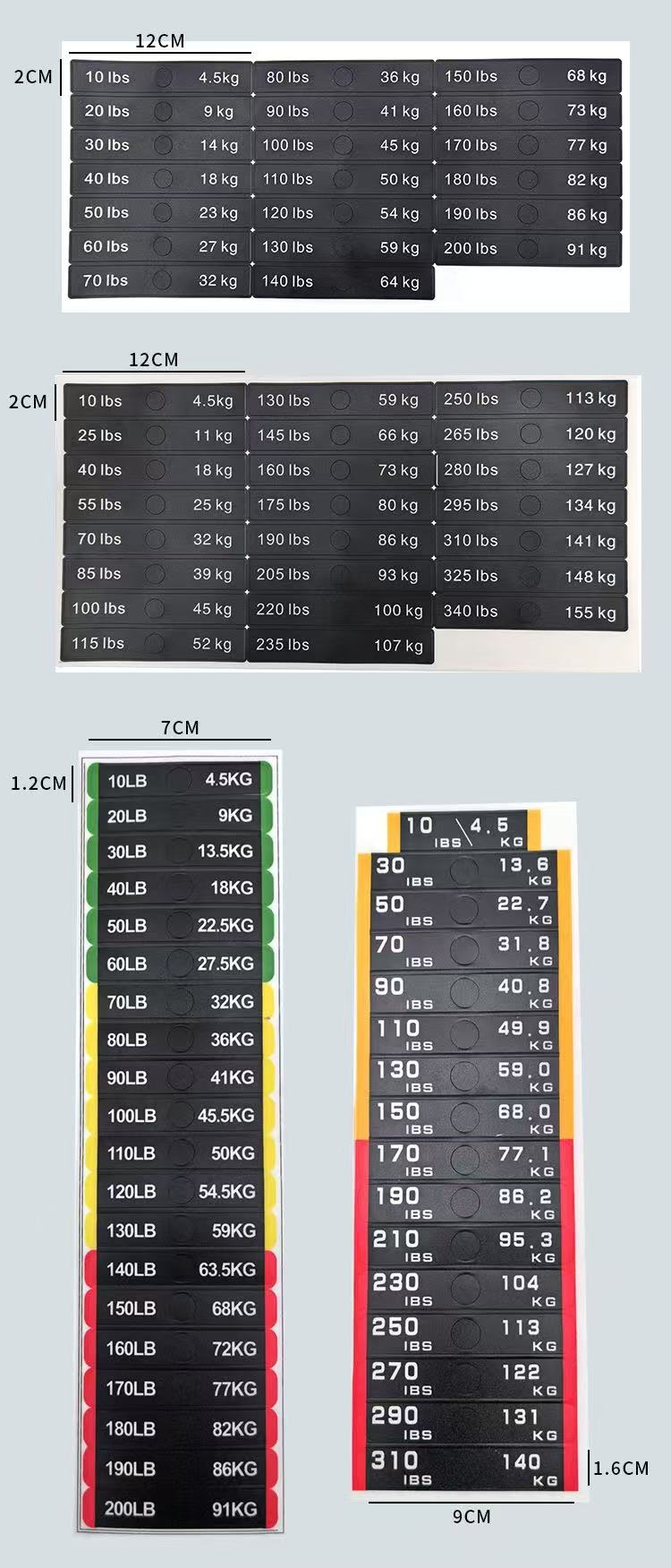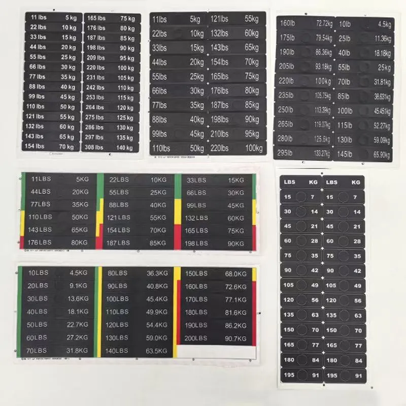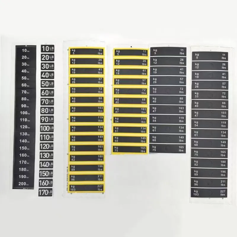 Ці вагові наклейки для блоків ваги для фітнес-обладнання є типом ідентифікаційних наклейок, спеціально розроблених для маркування ваги фітнес-обладнання. Зазвичай вони виготовлені з ПВХ матеріалу, і ви можете звернутися до таблиці параметрів продукту для конкретних розмірів. Значення ваги чітко позначені на наклейках, що дозволяє користувачам швидко визначити та вибрати відповідну вагу для тренувань.